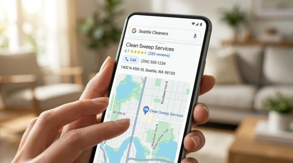 Type ‘house cleaner near me’ into Google while you’re sitting in Parramatta. What comes up first isn’t a list of websites it’s a map, with three local businesses pinned to it. Star ratings. Phone numbers. Distance from where you’re sitting. That’s called the Local Pack, and those three spots collect the bulk of clicks before anyone scrolls further.